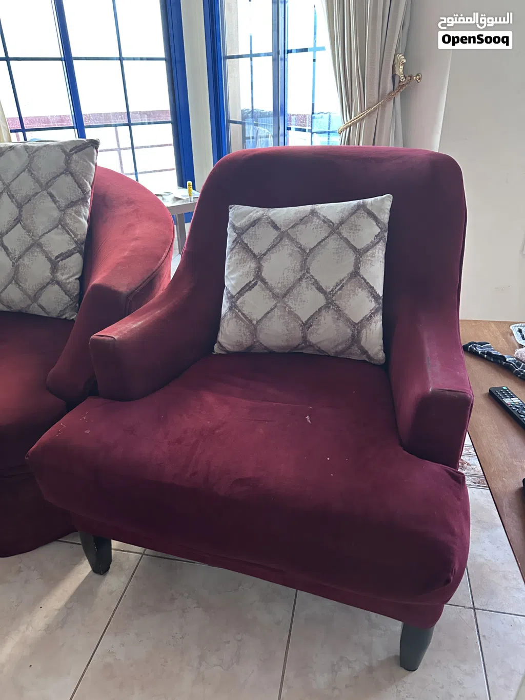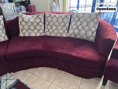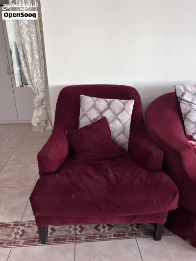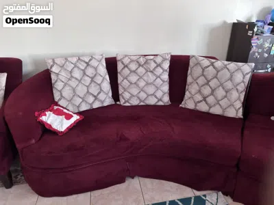 Two large 3-seater maroon sofa units, ideal for a big living room or majlis. Each sofa has a curved design with soft fabric upholstery and sturdy wooden legs, and comes with matching patterned cushions as shown in the photos. Both pieces are in used but comfortable condition with normal wear, no major damage.