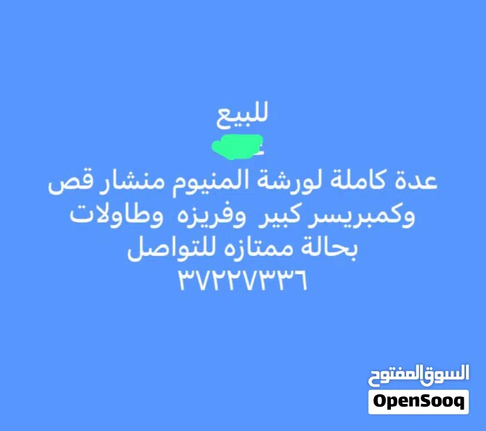من كمبريسر هوى كبير إيطالي + منشار قص إيطالي + فريزه إيطالي + طاولات حديد وزواية حديد للرفوف. مع الأخشاب بحاله ممتازه
