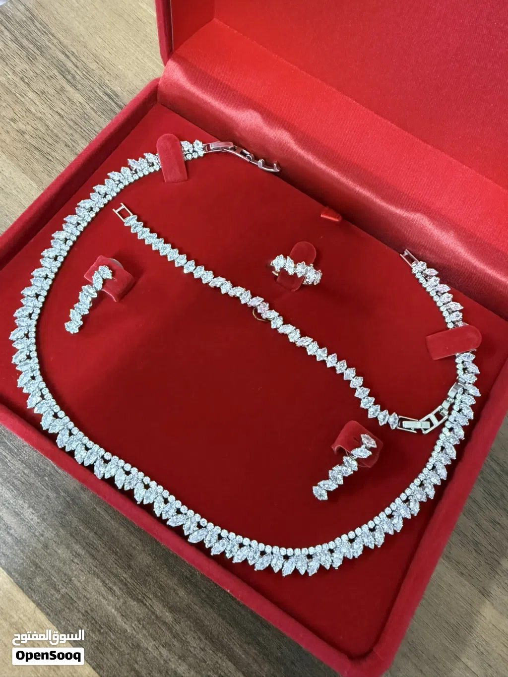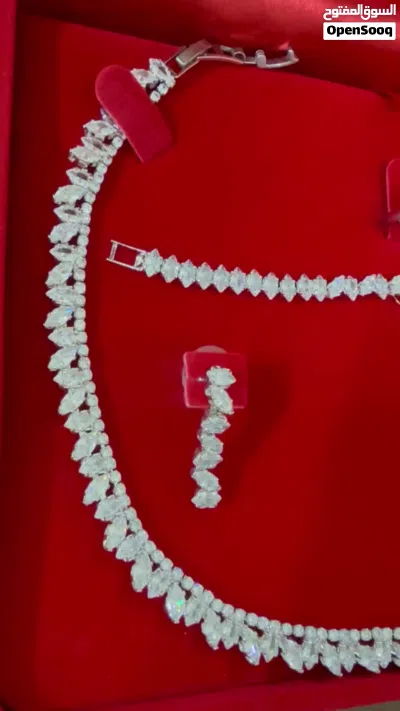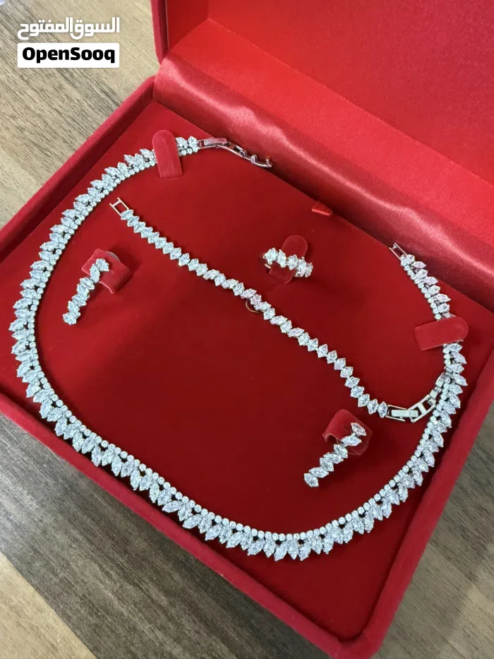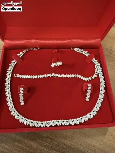 طقم زركون أصلي راقي جداً وأنيق مكون من ( سلسلة وتراكي وخاتم وإسوارة ) / استعمال بسيط جداً سويعات فقط مع ضمان عدم تغير لونه ، السعر 15 دينار فقط