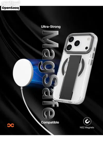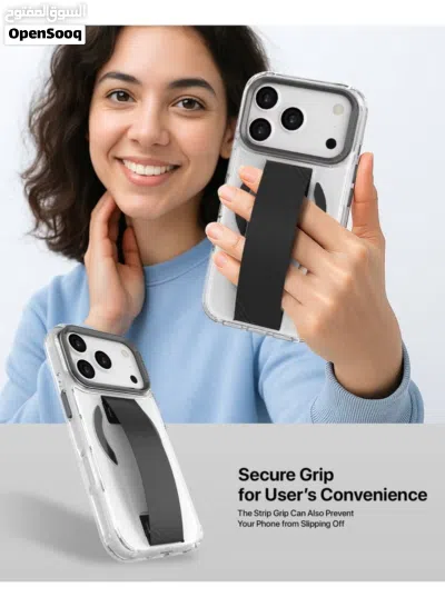 Premium clear iPhone 17 Pro Max case with soft grip strap, metallic camera stand, MagSafe support, raised edges, and anti-shock protection. Slim, durable, and stylish.