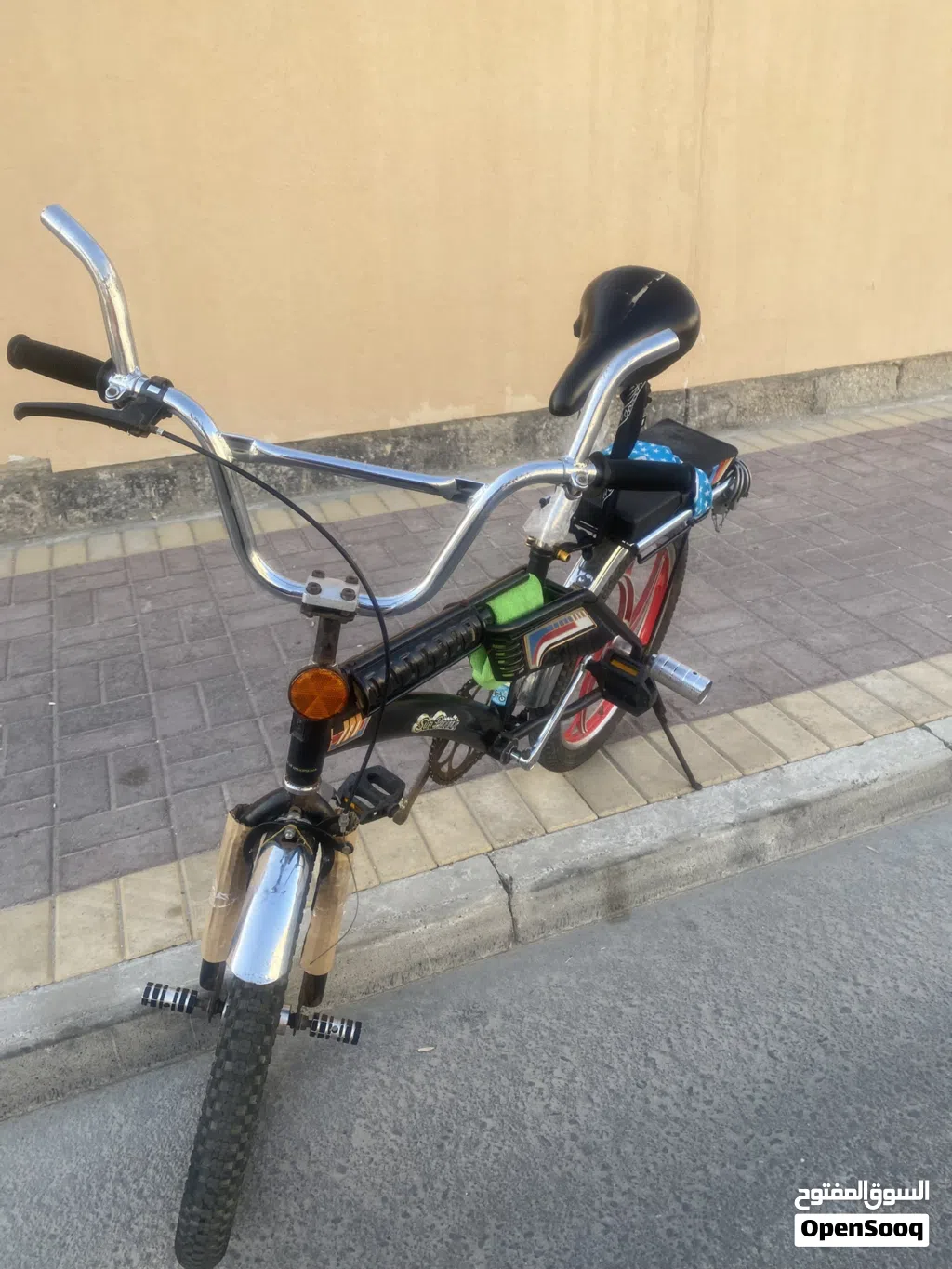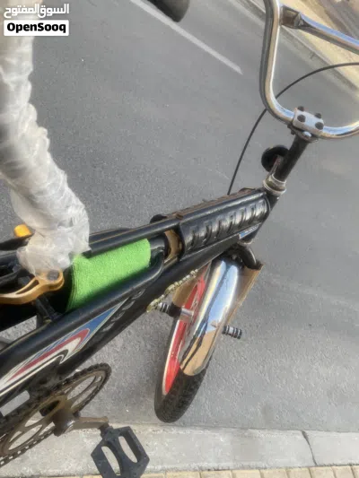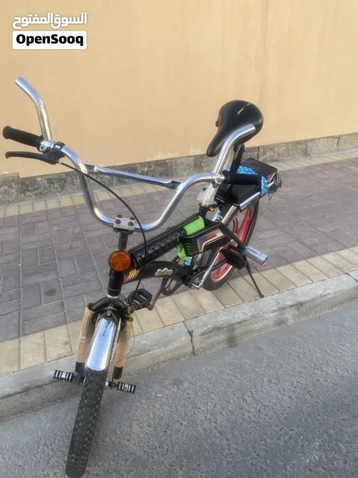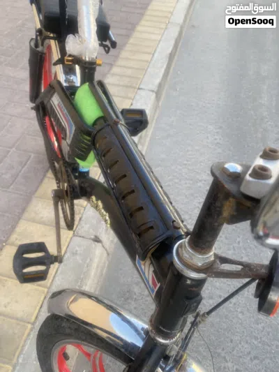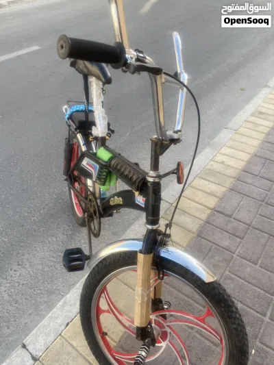 الدراجة الهوائية الظاهرة في الصورة ذات طابع كلاسيكي قديم ومناسبة للأطفال أو للاستخدام الخفيف داخل الأحياء. لونها الأساسي أسود مع لمسات حمراء واضحة في الجنطين، ما يعطيها شكلاً لافتًا. المقود مرتفع ومصنوع من المعدن اللامع، مع مقبضين أسودين لراحة اليد. يوجد مقعد طويل مع مسند خلفي، مما يسمح بالجلوس المريح وربما حمل طفل صغير. الإطارات متوسطة السماكة، والدواسات معدنية. كما يظهر وجود عاكس ضوئي أمامي لزيادة الأمان، وتصميمها العام بسيط وقوي ويعكس دراجات الزمن الجميل.