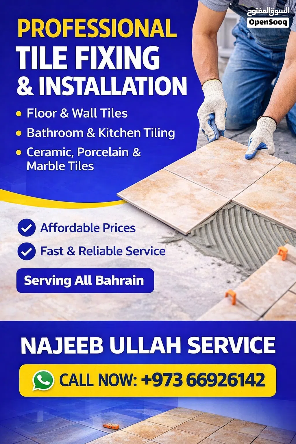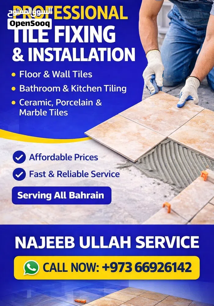 We provide professional tile fixing and installation services across all Bahrain. Our experienced team specializes in floor tiles, wall tiles, bathroom tiles, kitchen tiles, ceramic, porcelain, and marble tiles.