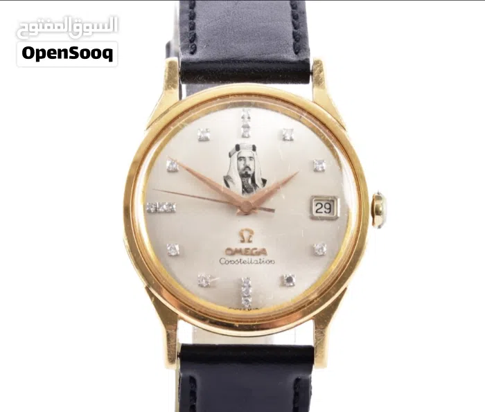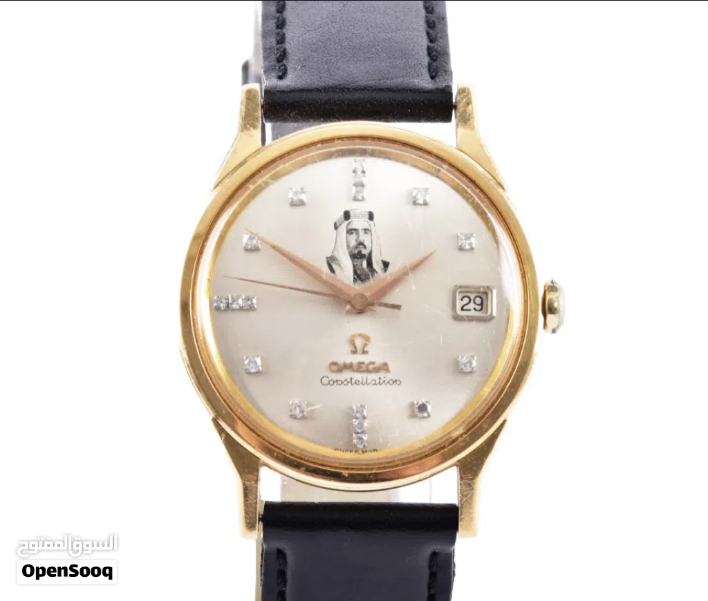 The silvered dial applied with diamond hour markers and baton accents, signed Omega Constellation, and decorated with a portrait of Sheikh Isa bin Salman Al Khalifa, Ruler of Bahrain.