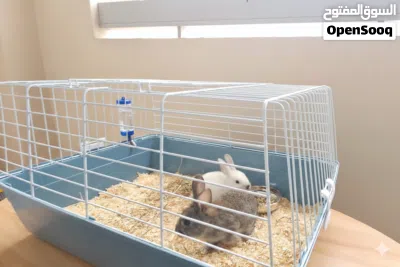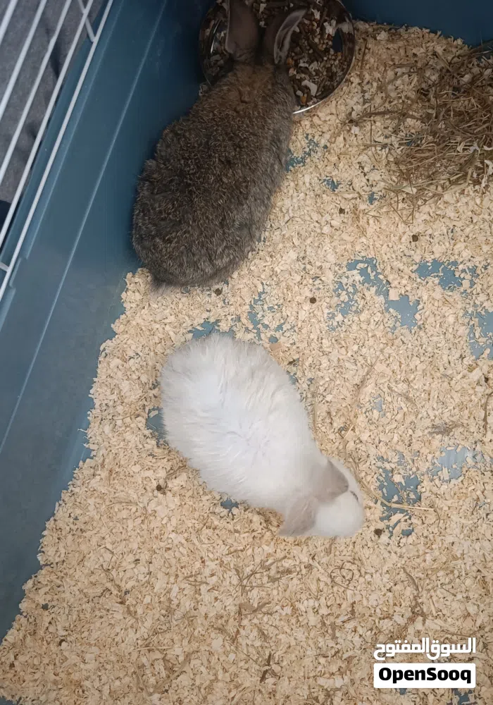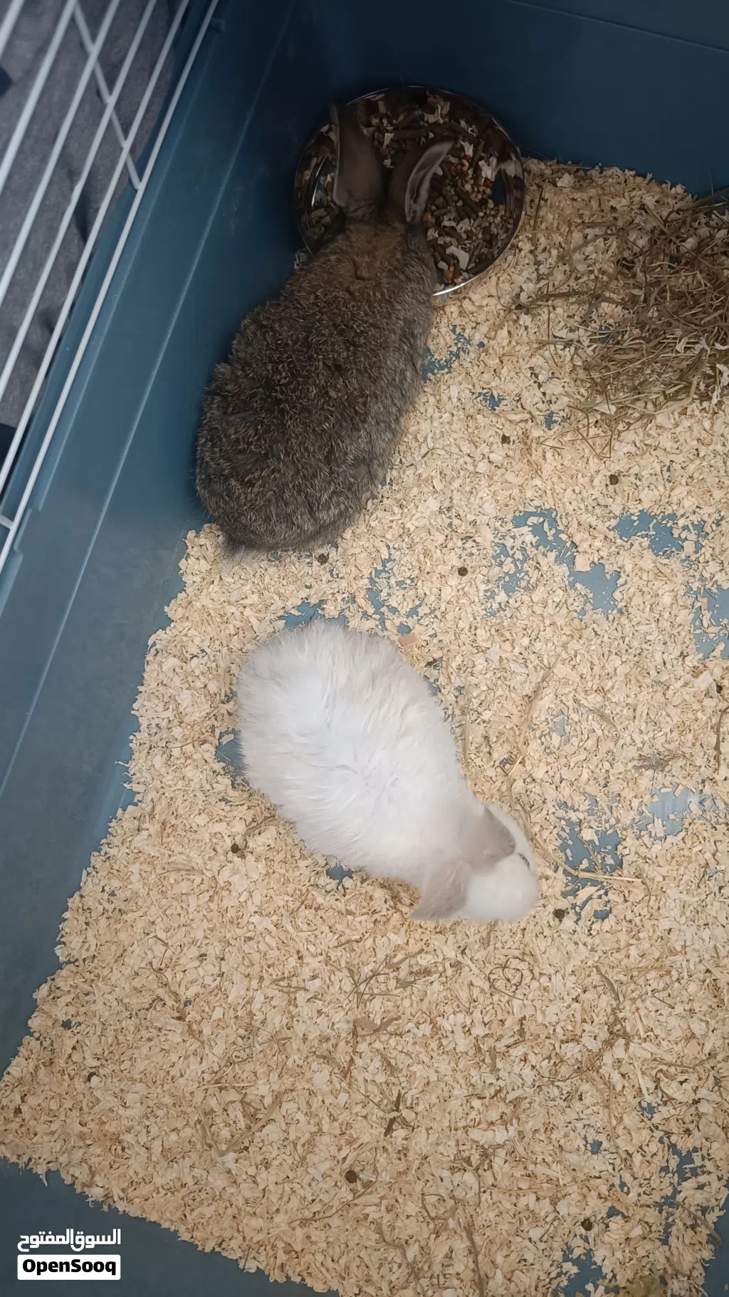 2 rabbits male and female along with nest, pet bottle, wood shelves and food balance available