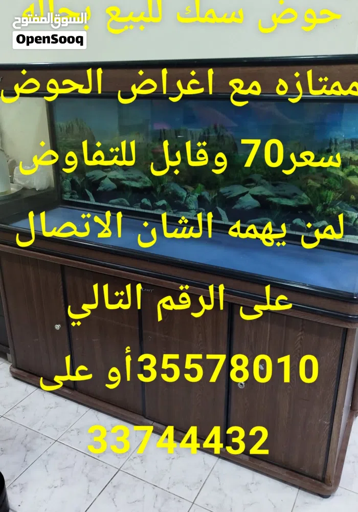 حوض سمك للبيع بحاله ممتازه مع اغراض الحوض مقابل للتفاوض