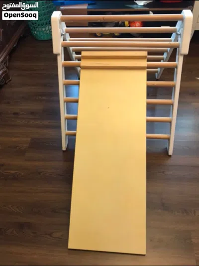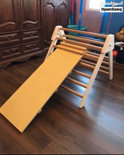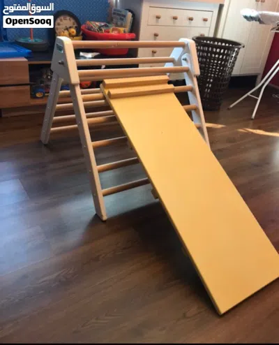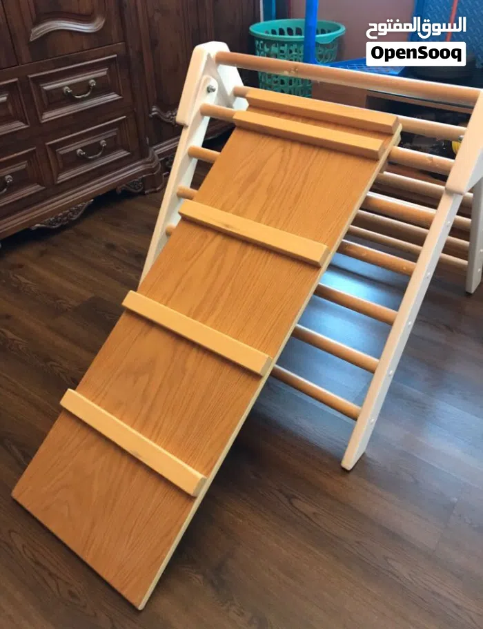 Pickler for babies: it helps the kids learn how to climb and slide at home. Can be folded and stored easily in the room. Made from wood. Comes in 2 parts: the ladder (stand) and the slide (has 2 faces)