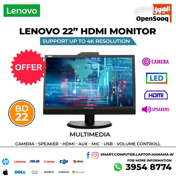 LENOVO 22" FHD Monitor - HDMI - Camera - LED - Speaker - Multimedia Support Up To 4K Cell Click to show phone number.. 395487XXWide Display Good working