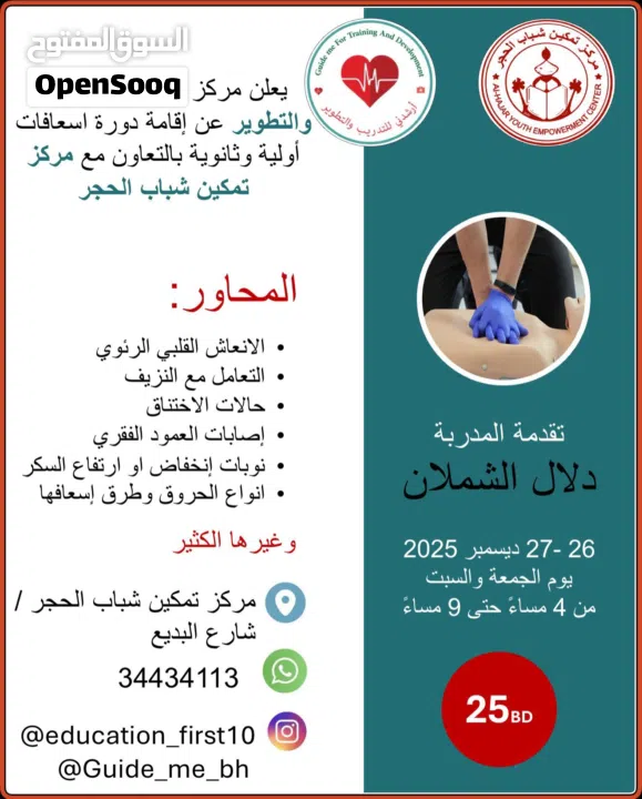 *يعلن مركز أرشدني للتدريب والتطوير* عن إقامة *دورة الإسعافات الأولية والرعاية الثانوية*